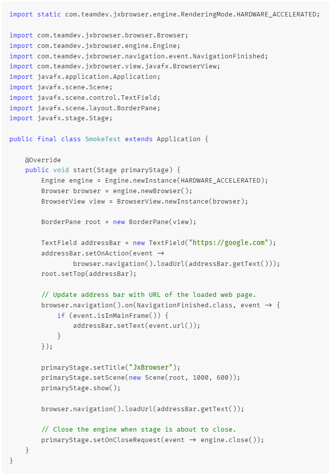 JxBrowser 是一个第三方库,您需要将其作为依赖项添加到项目中。 您可以简单地下载并将其添加到您的应用程序类路径中,或者快速将其添加到您的 Gradle 或 Maven 项目中。